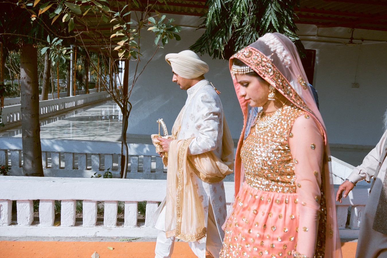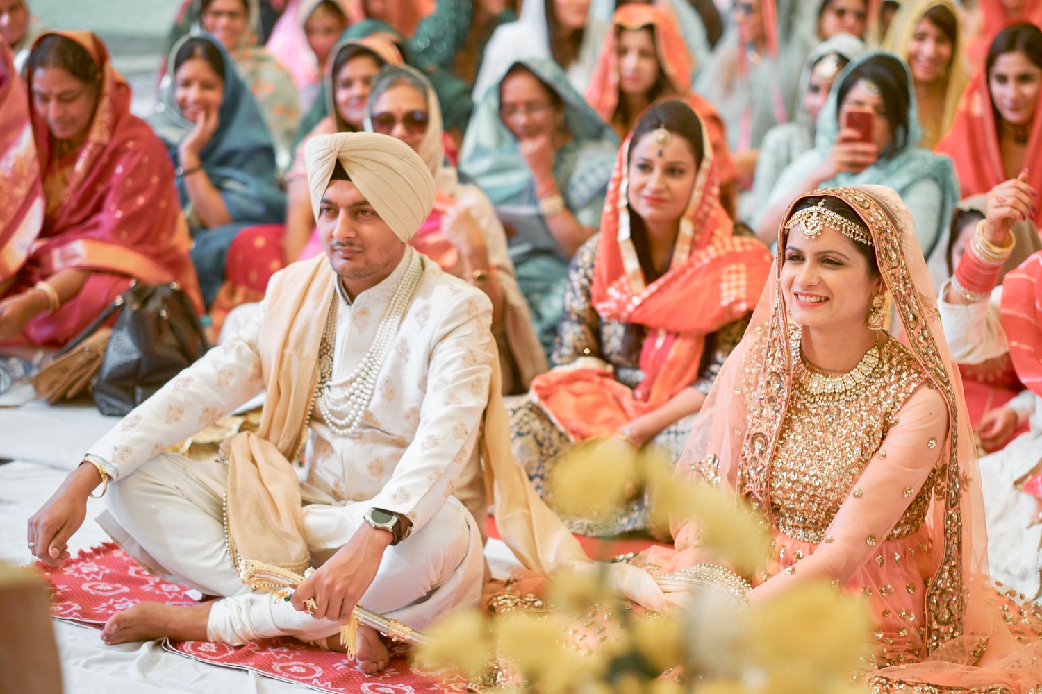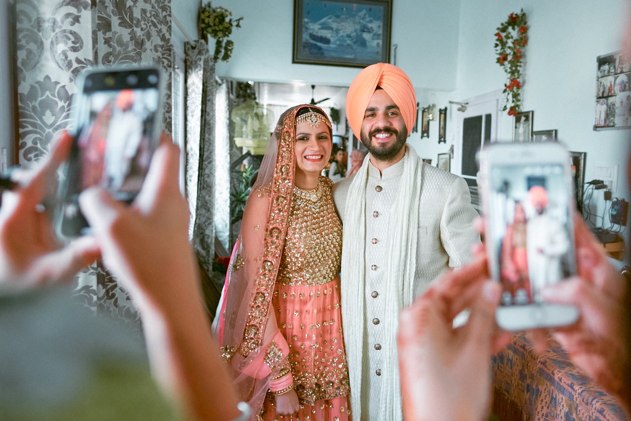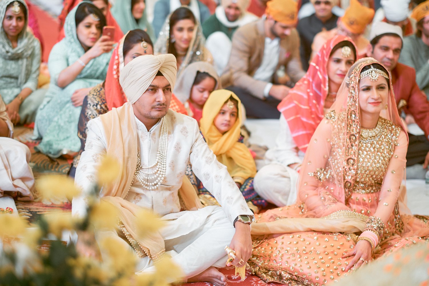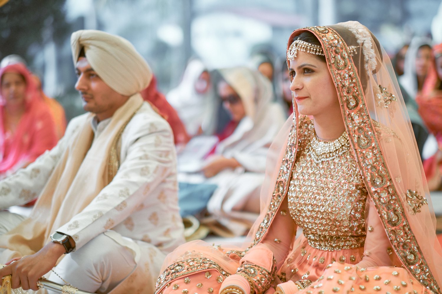 The bride was stunning in a traditional Punjabi peach and gold bridal outfit, complete with intricate jewellery and elaborate hair styling. The groom was dashing in traditional kurta and turban, looking every bit the proud and happy groom.