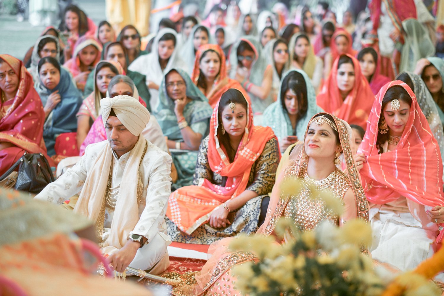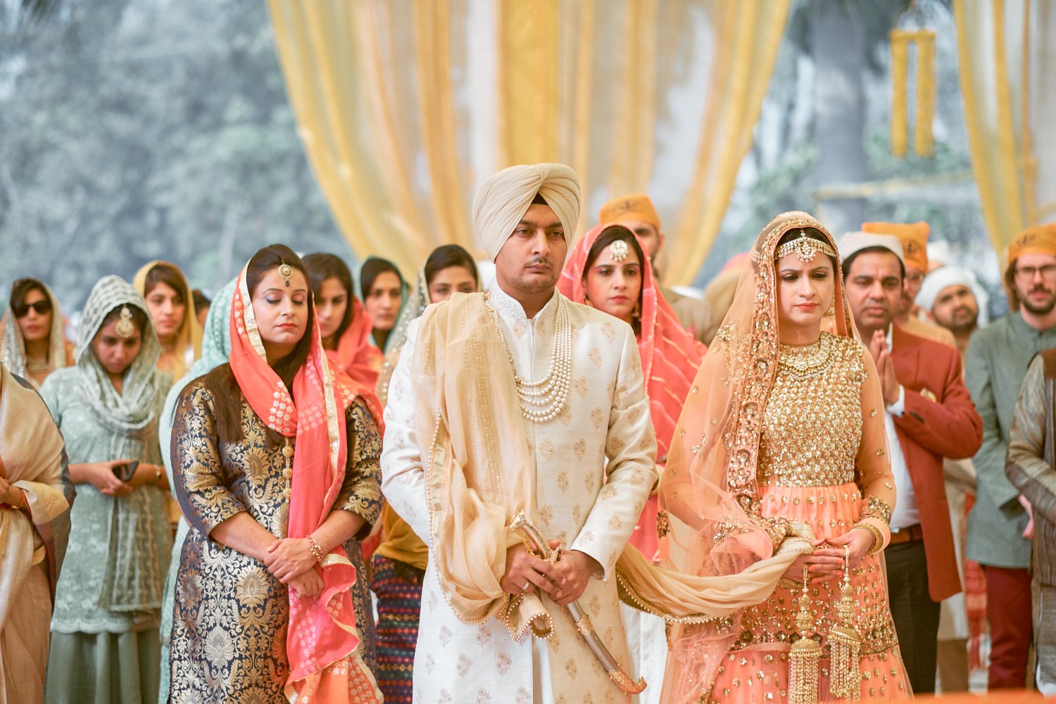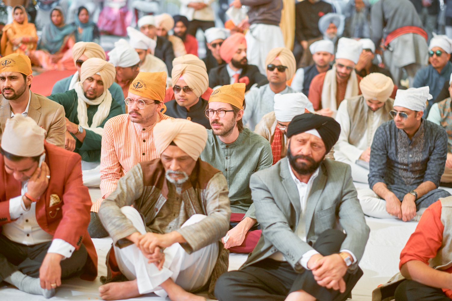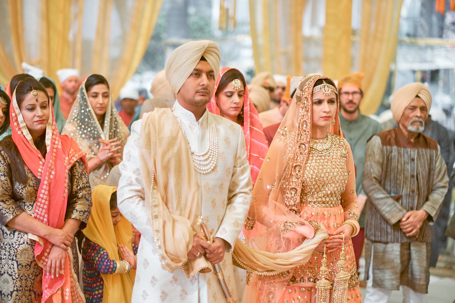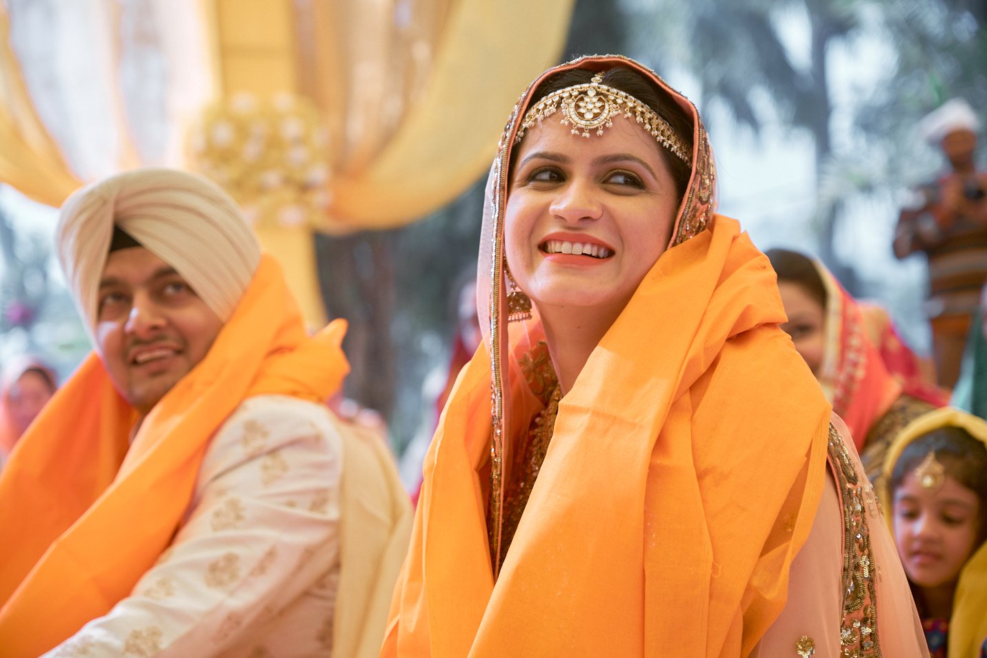 The bride was stunning in a traditional Punjabi peach and gold bridal outfit, complete with intricate jewellery and elaborate hair styling. The groom was dashing in traditional kurta and turban, looking every bit the proud and happy groom.