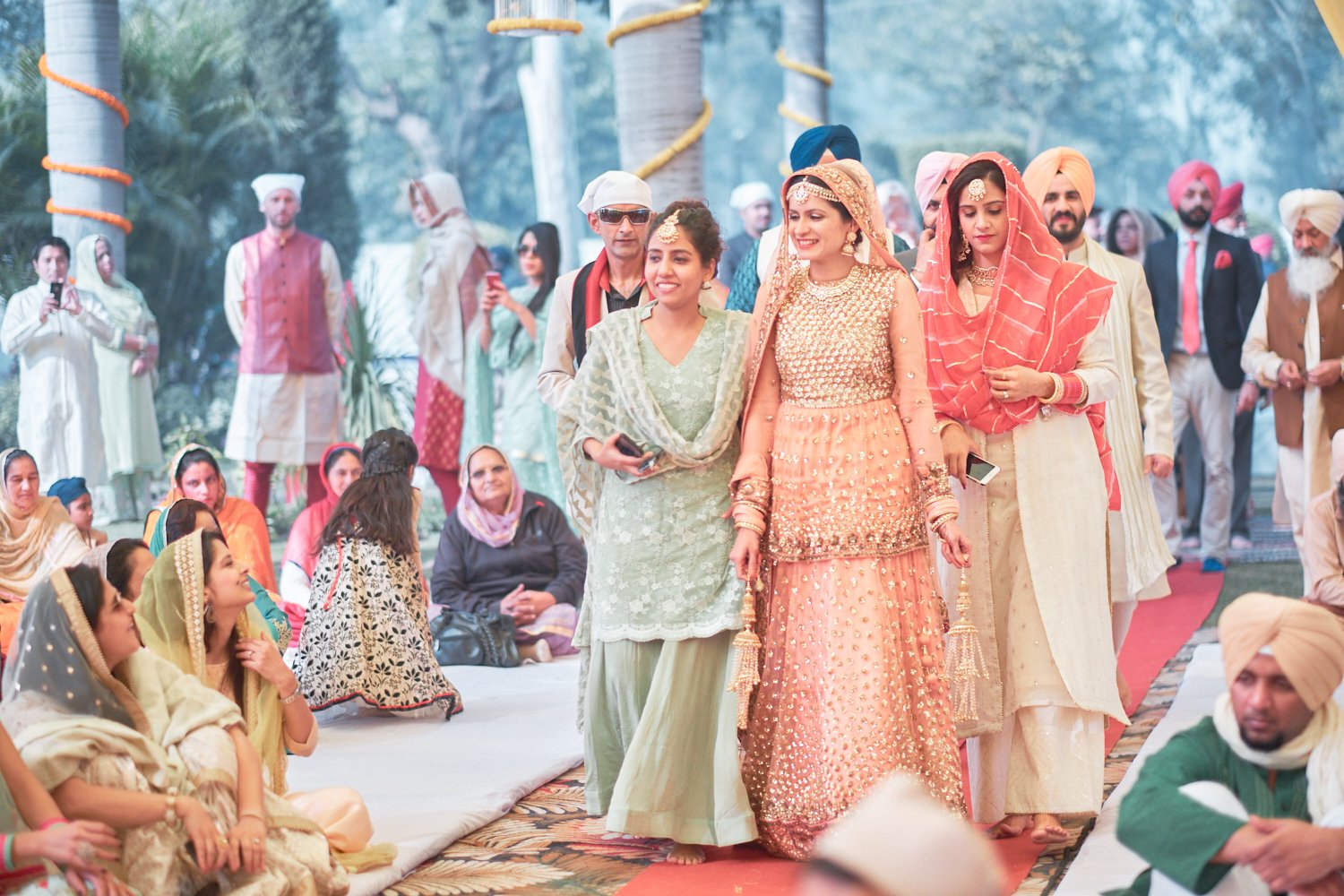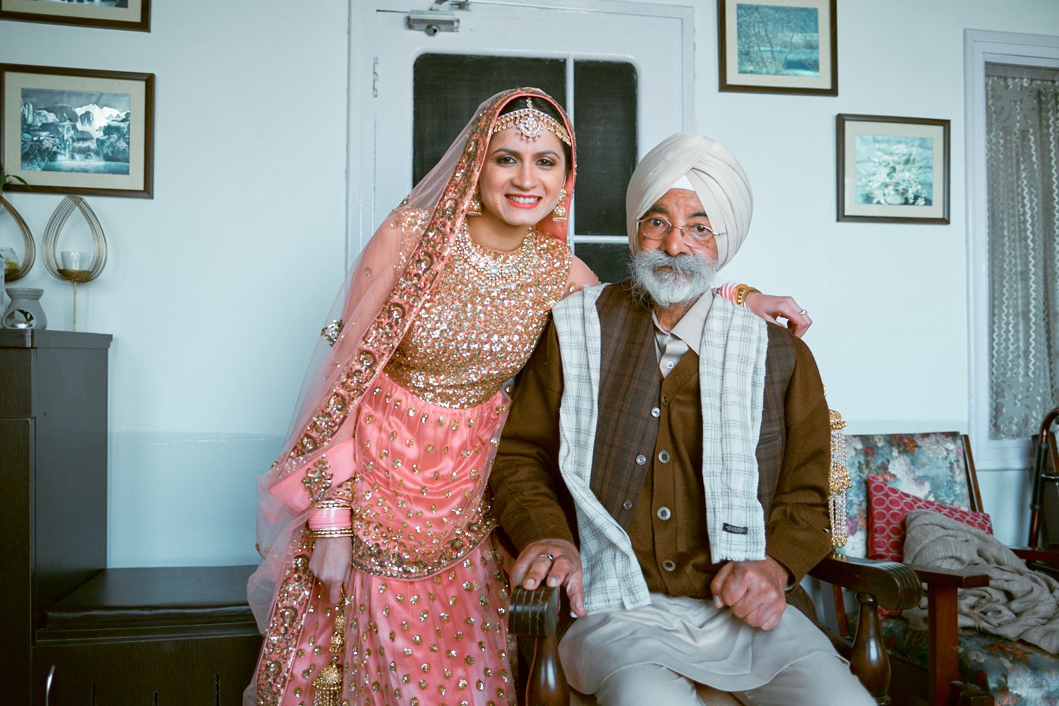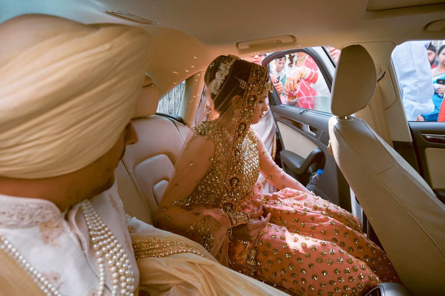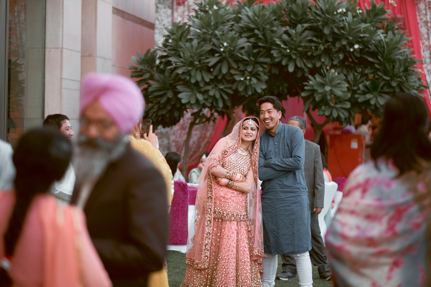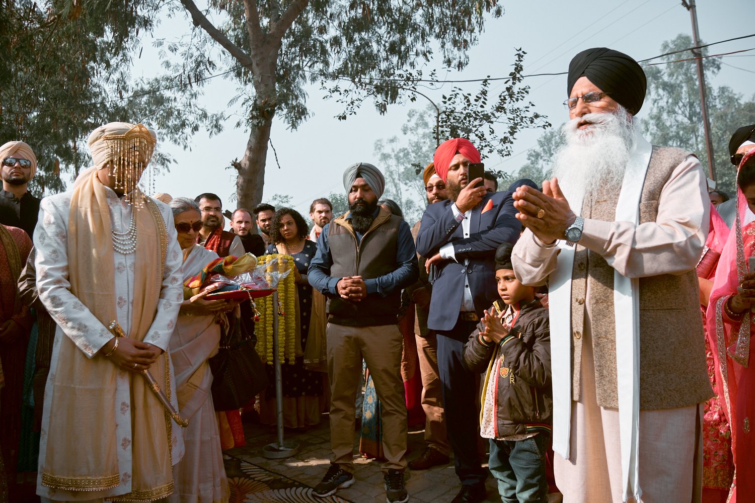 The bride was stunning in a traditional Punjabi peach and gold bridal outfit, complete with intricate jewellery and elaborate hair styling. The groom was dashing in traditional kurta and turban, looking every bit the proud and happy groom.