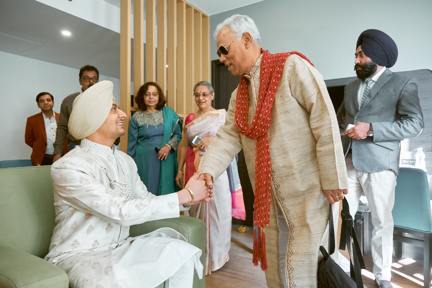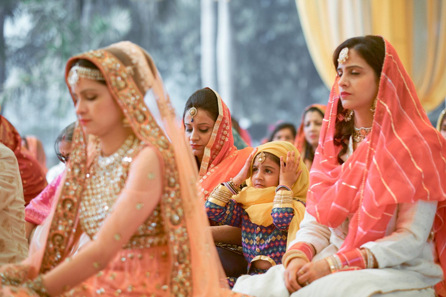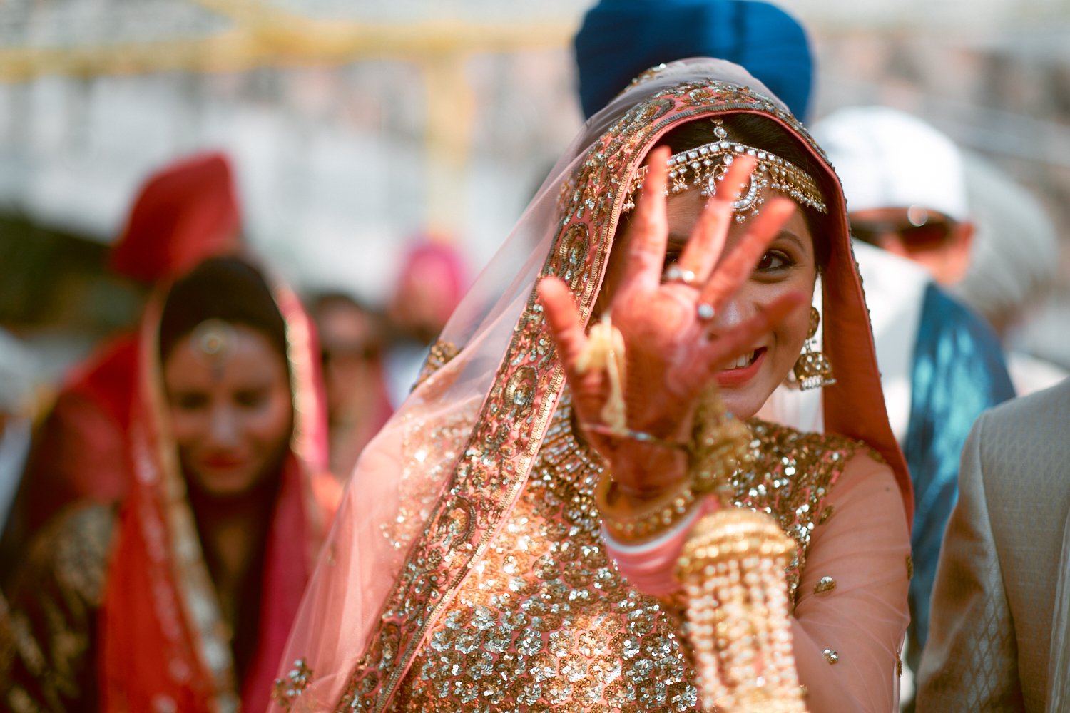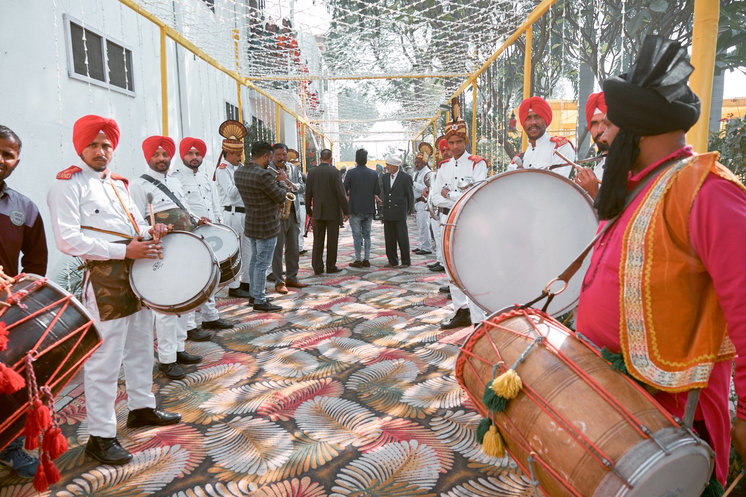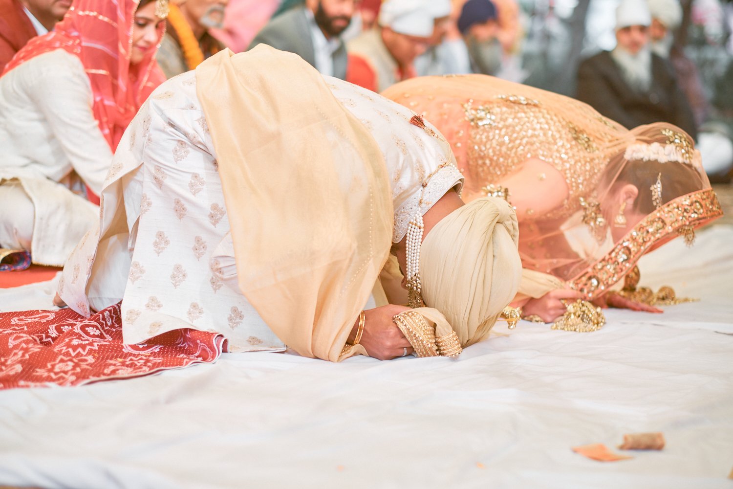The bride was stunning in a traditional Punjabi peach and gold bridal outfit, complete with intricate jewellery and elaborate hair styling. The groom was dashing in traditional kurta and turban, looking every bit the proud and happy groom.