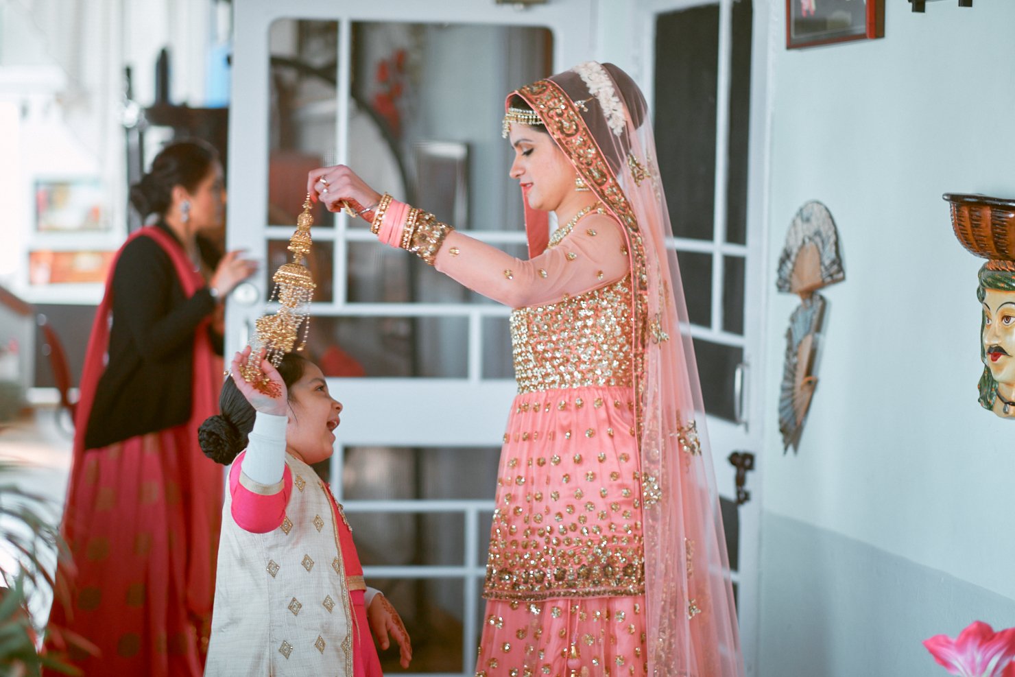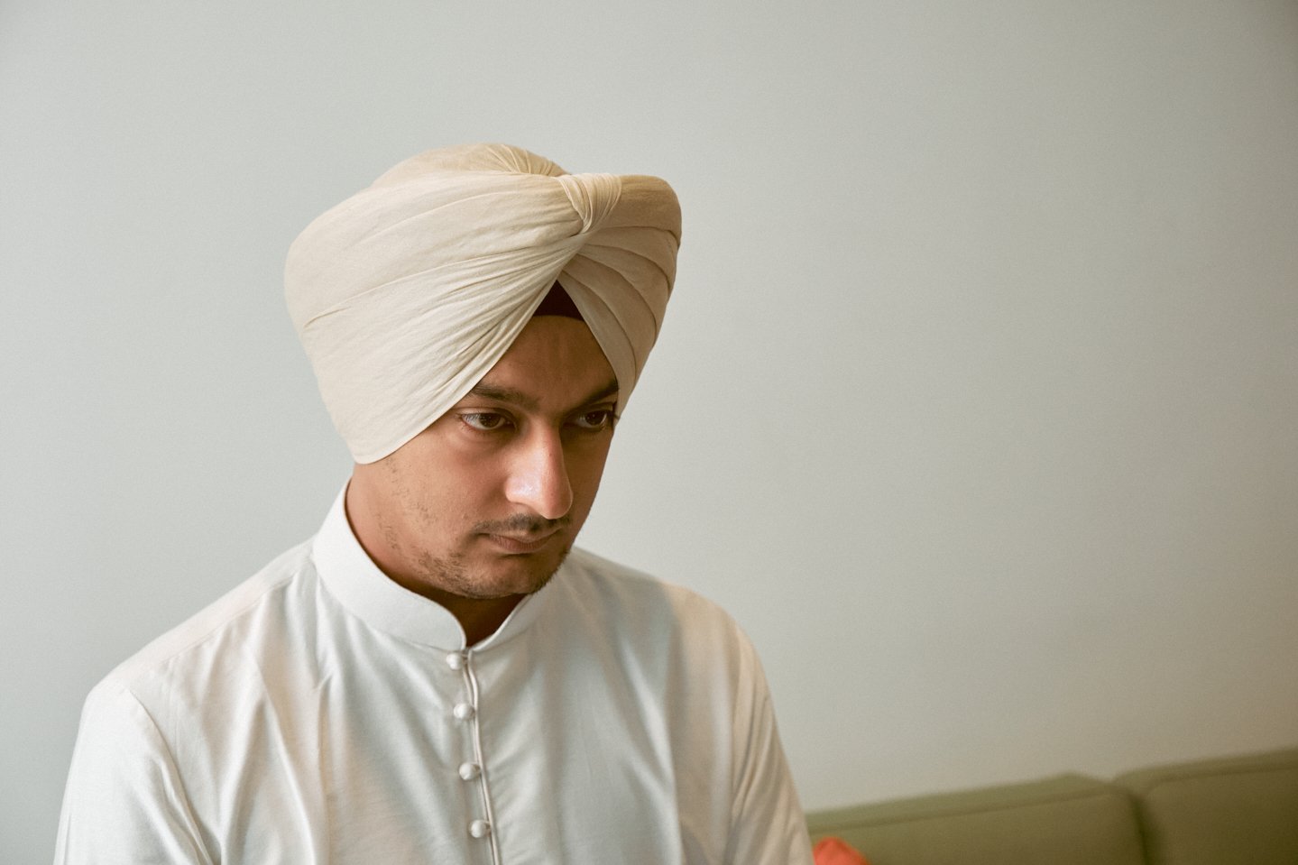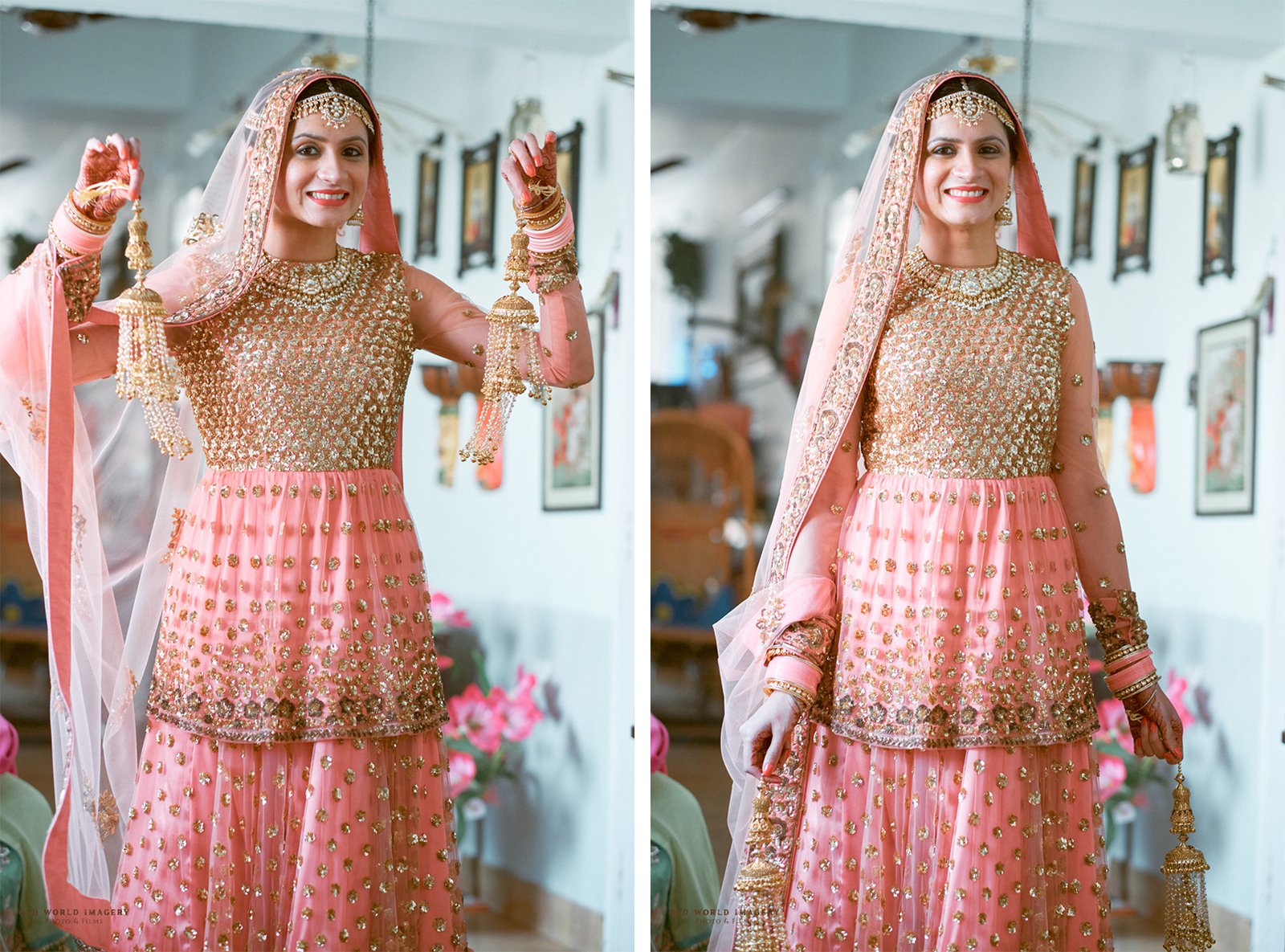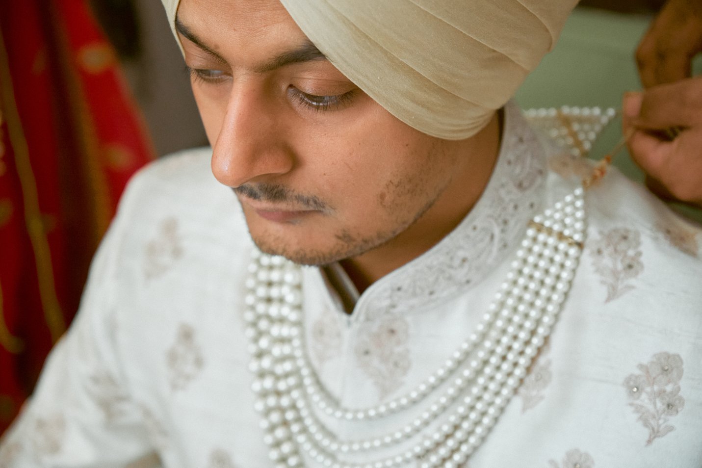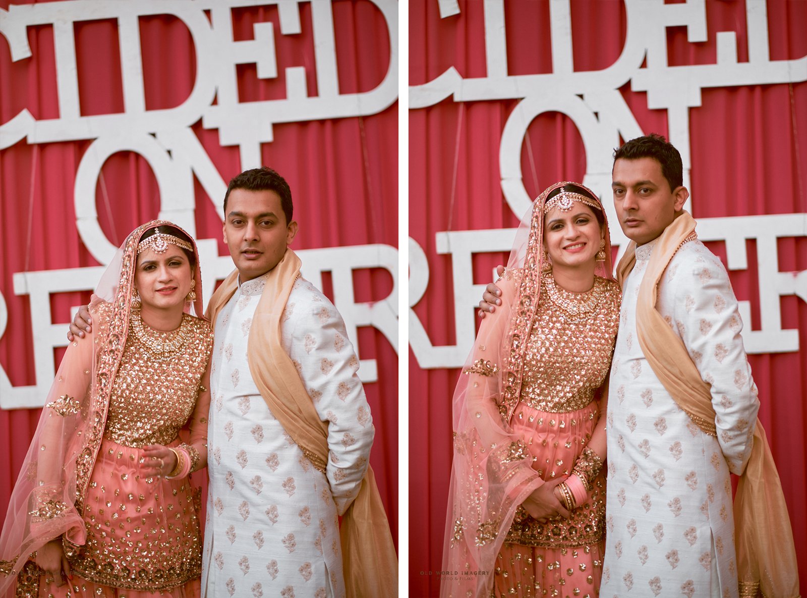 The bride was stunning in a traditional Punjabi peach and gold bridal outfit, complete with intricate jewellery and elaborate hair styling. The groom was dashing in traditional kurta and turban, looking every bit the proud and happy groom.