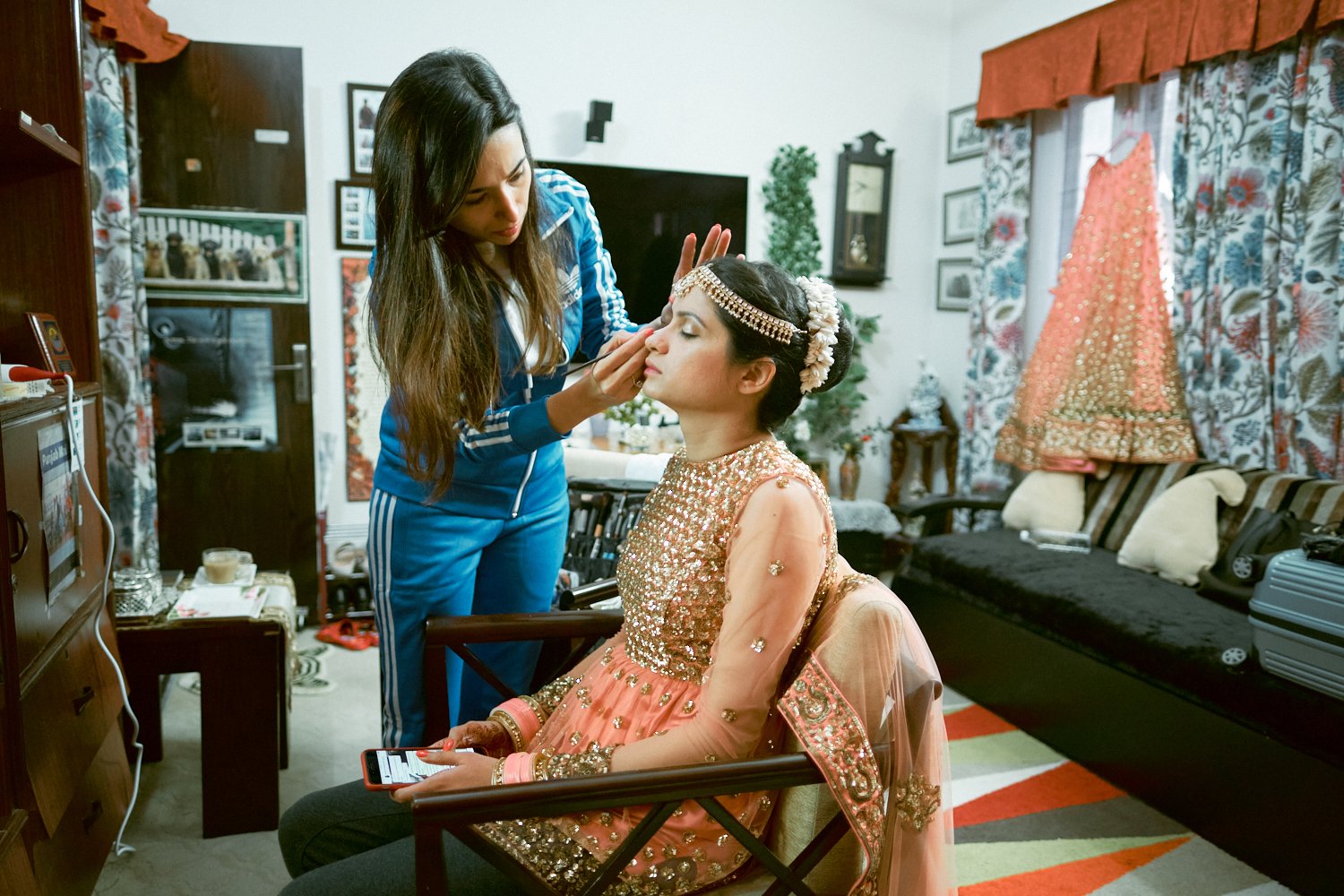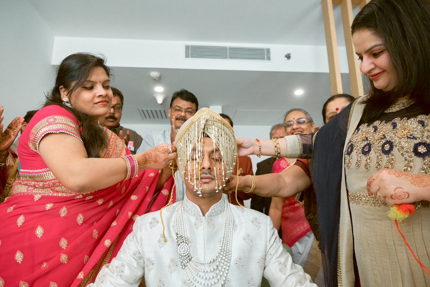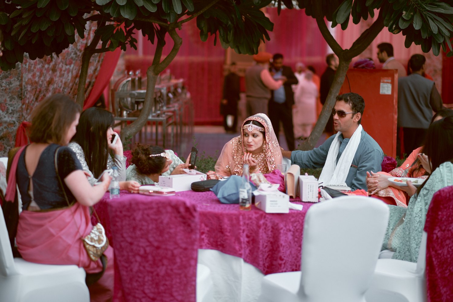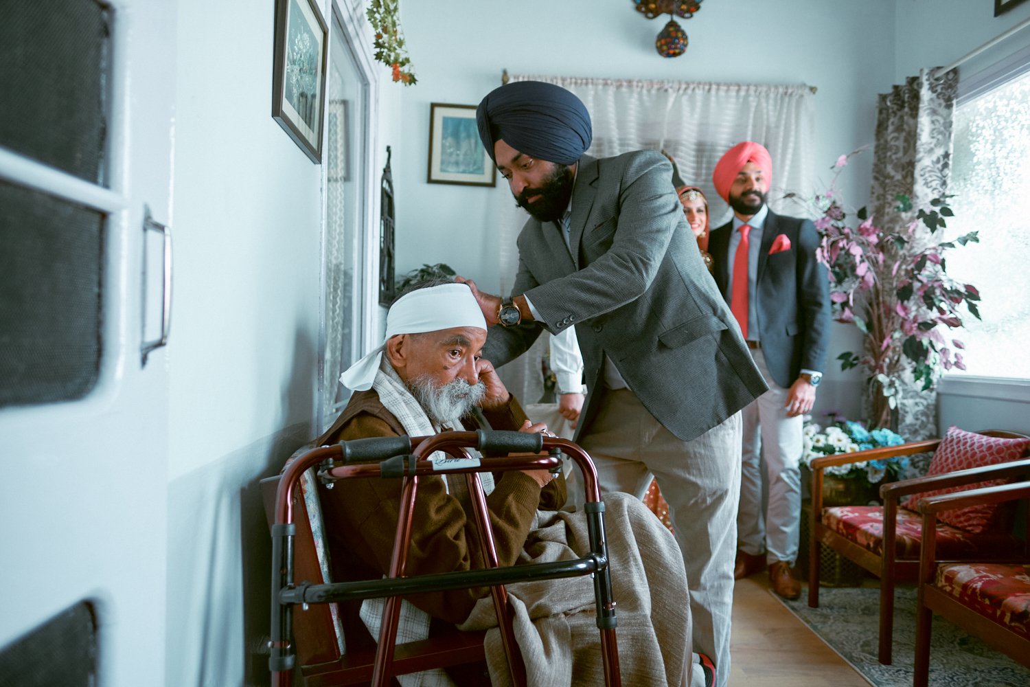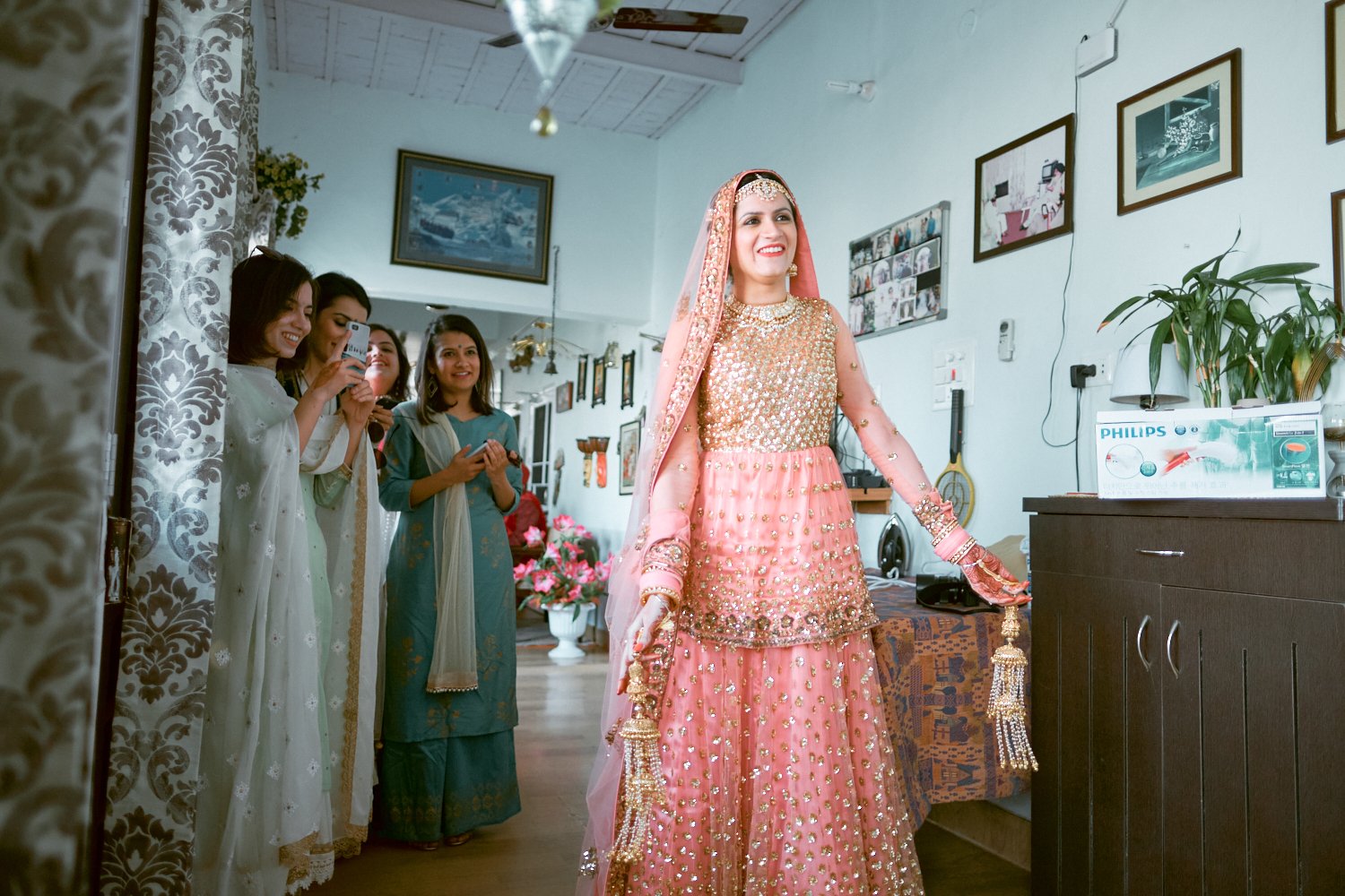 The bride was stunning in a traditional Punjabi peach and gold bridal outfit, complete with intricate jewellery and elaborate hair styling. The groom was dashing in traditional kurta and turban, looking every bit the proud and happy groom.