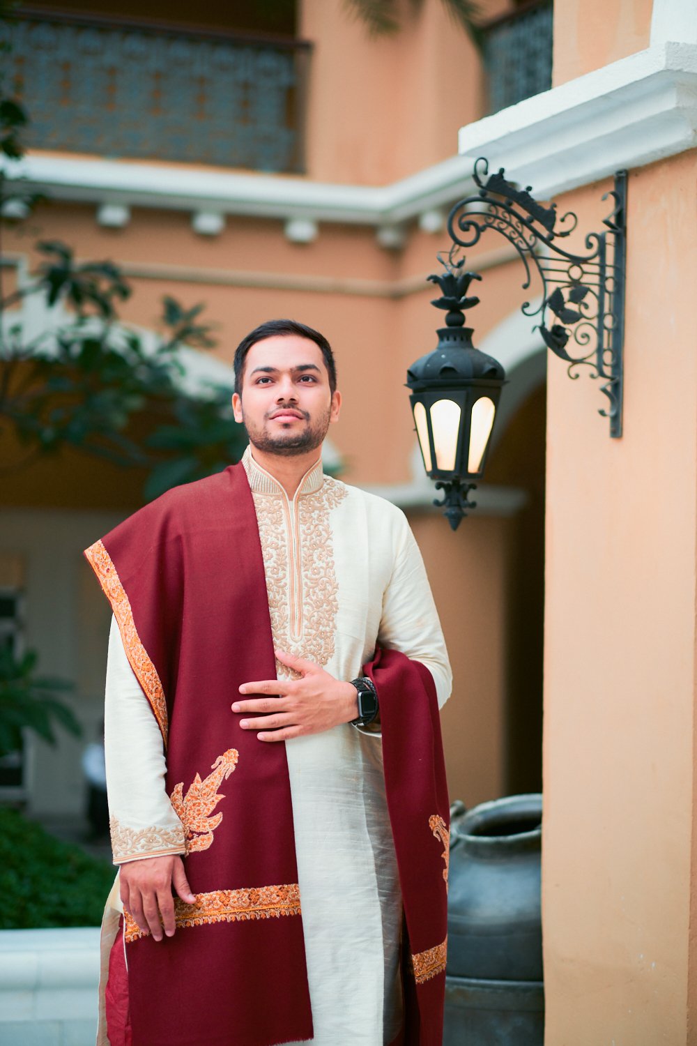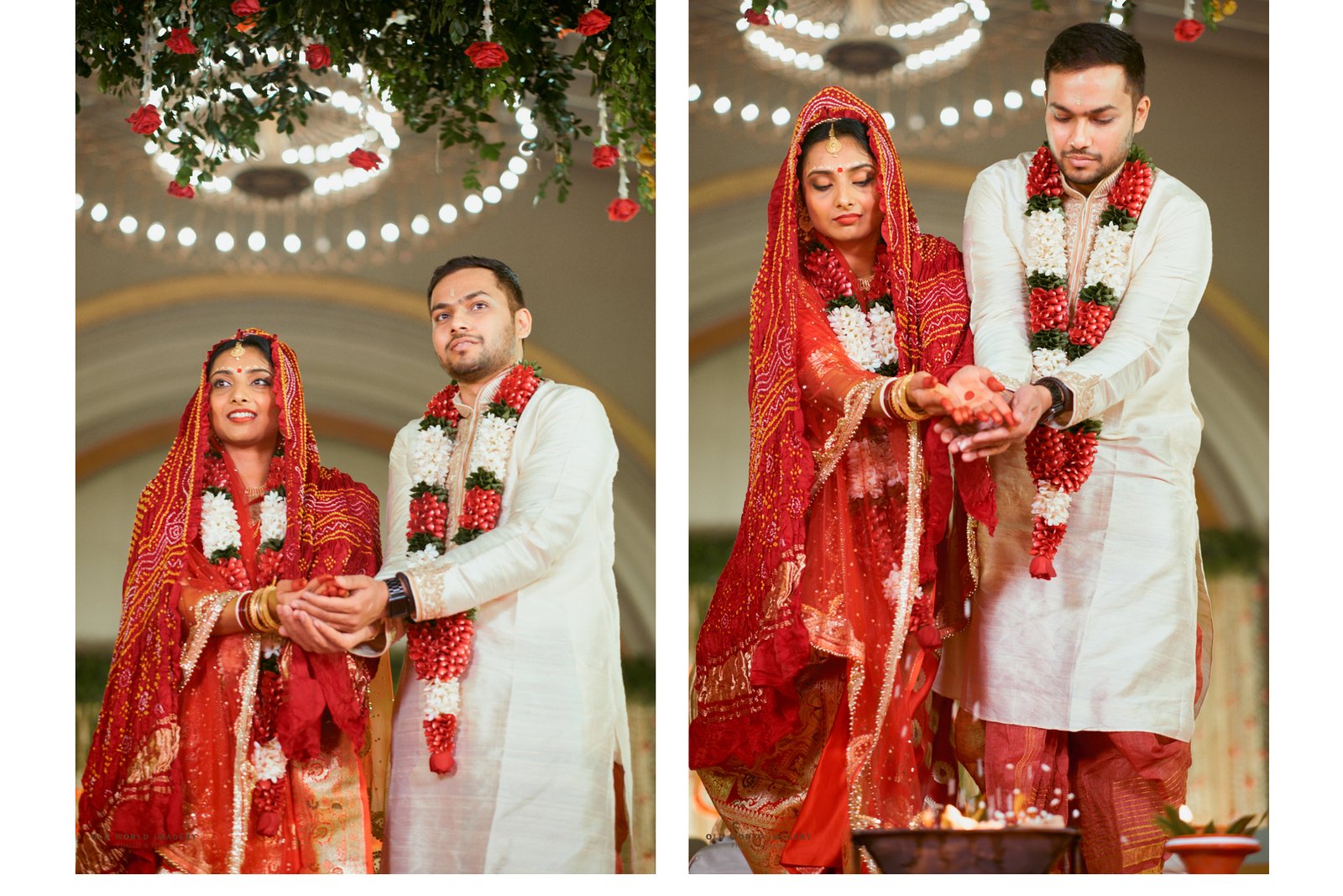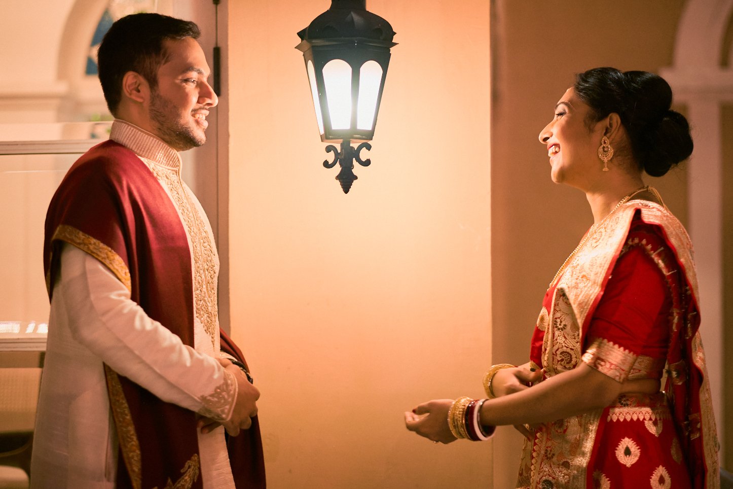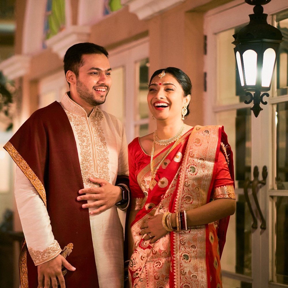 As a fun-loving couple, Amrita and Aagam’s wedding was filled with laughter, music, and dancing. The bride and groom looked stunning together, with Amrita in a traditional Bengali red Banarasi saree, adorned with gold jewellery, and Aagam in a sharp, cream-colored sherwani.