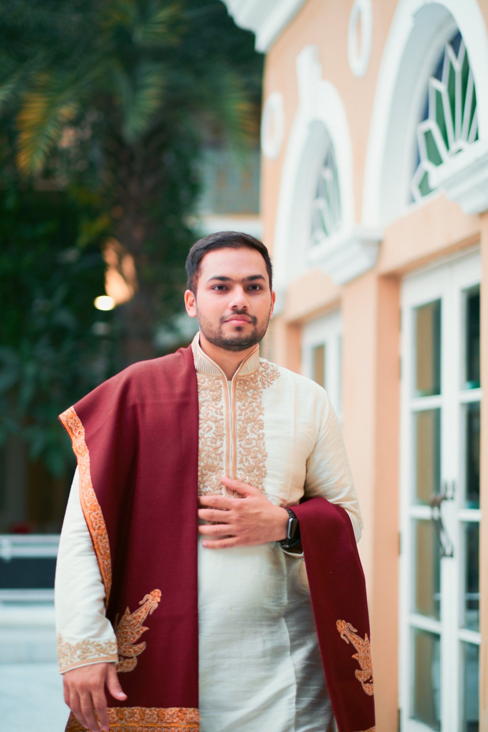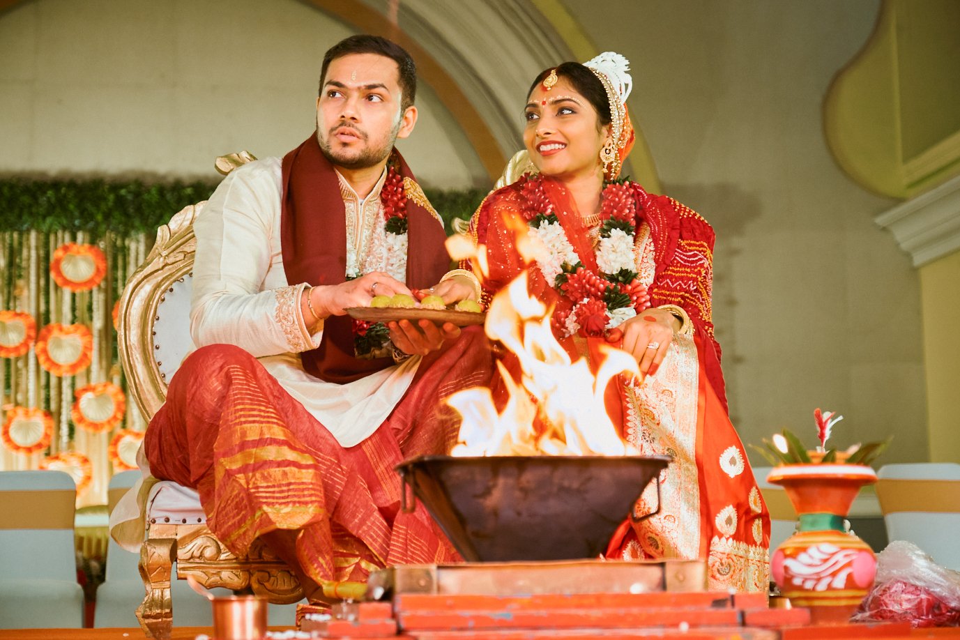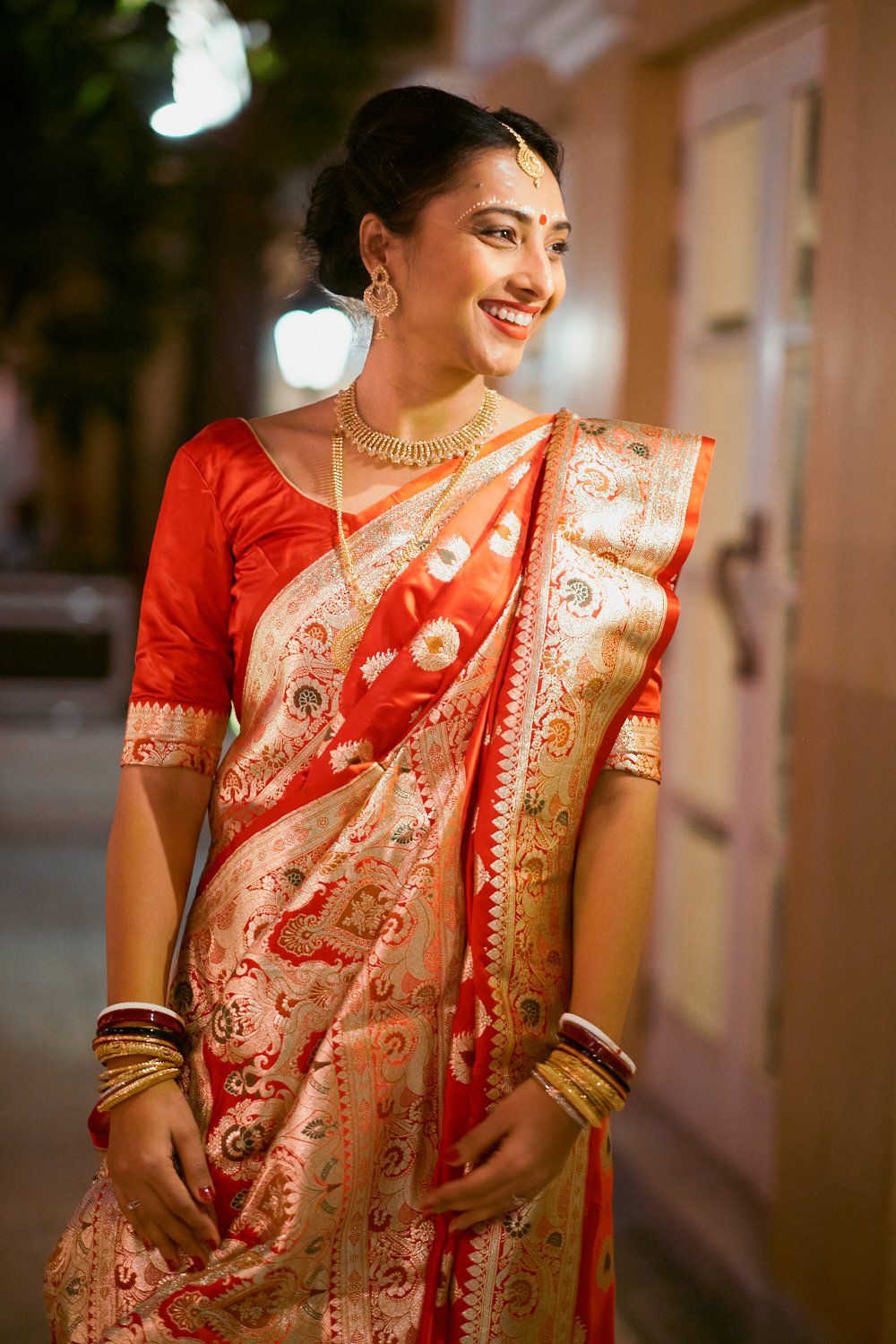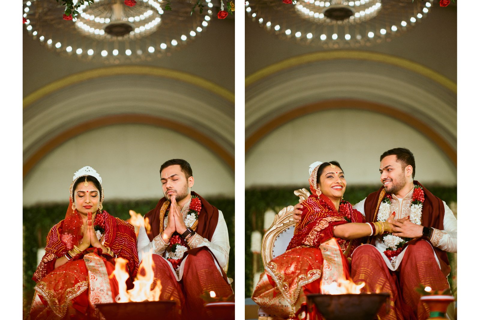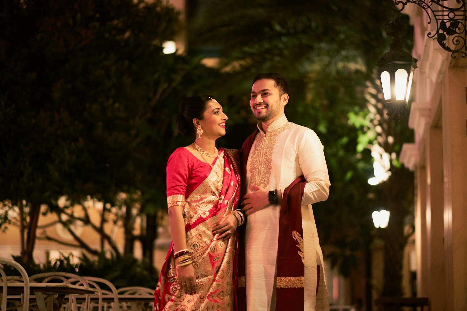 As a fun-loving couple, Amrita and Aagam’s wedding was filled with laughter, music, and dancing. The bride and groom looked stunning together, with Amrita in a traditional Bengali red Banarasi saree, adorned with gold jewellery, and Aagam in a sharp, cream-colored sherwani.