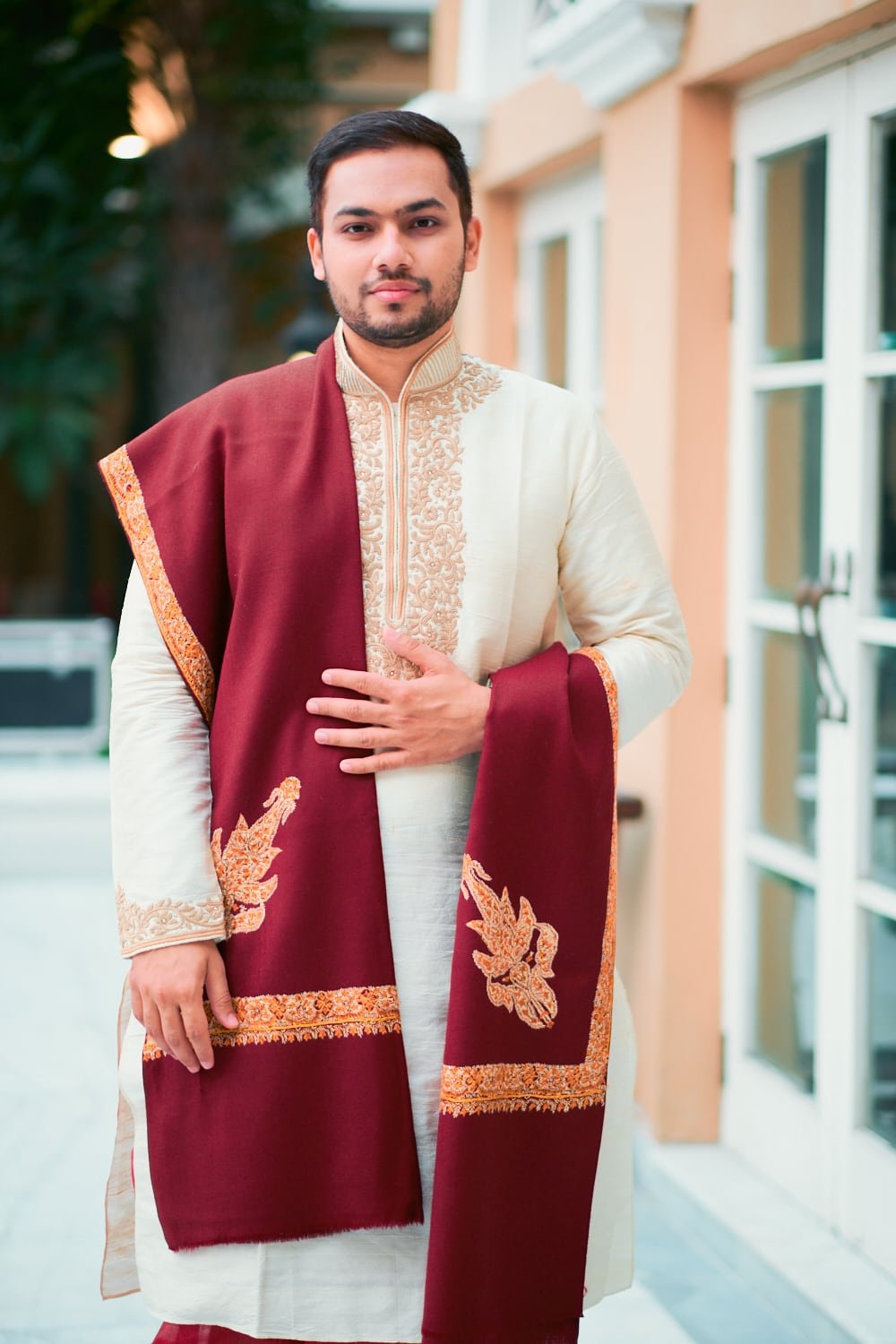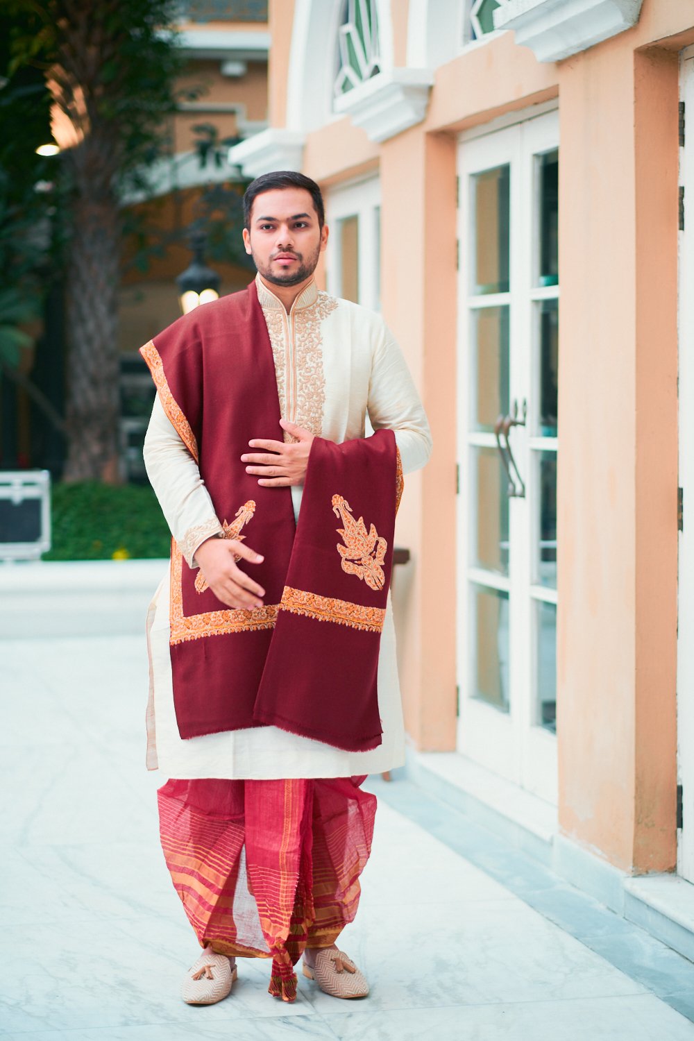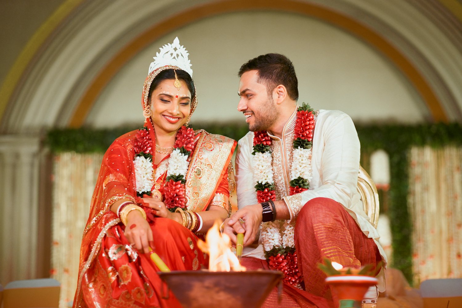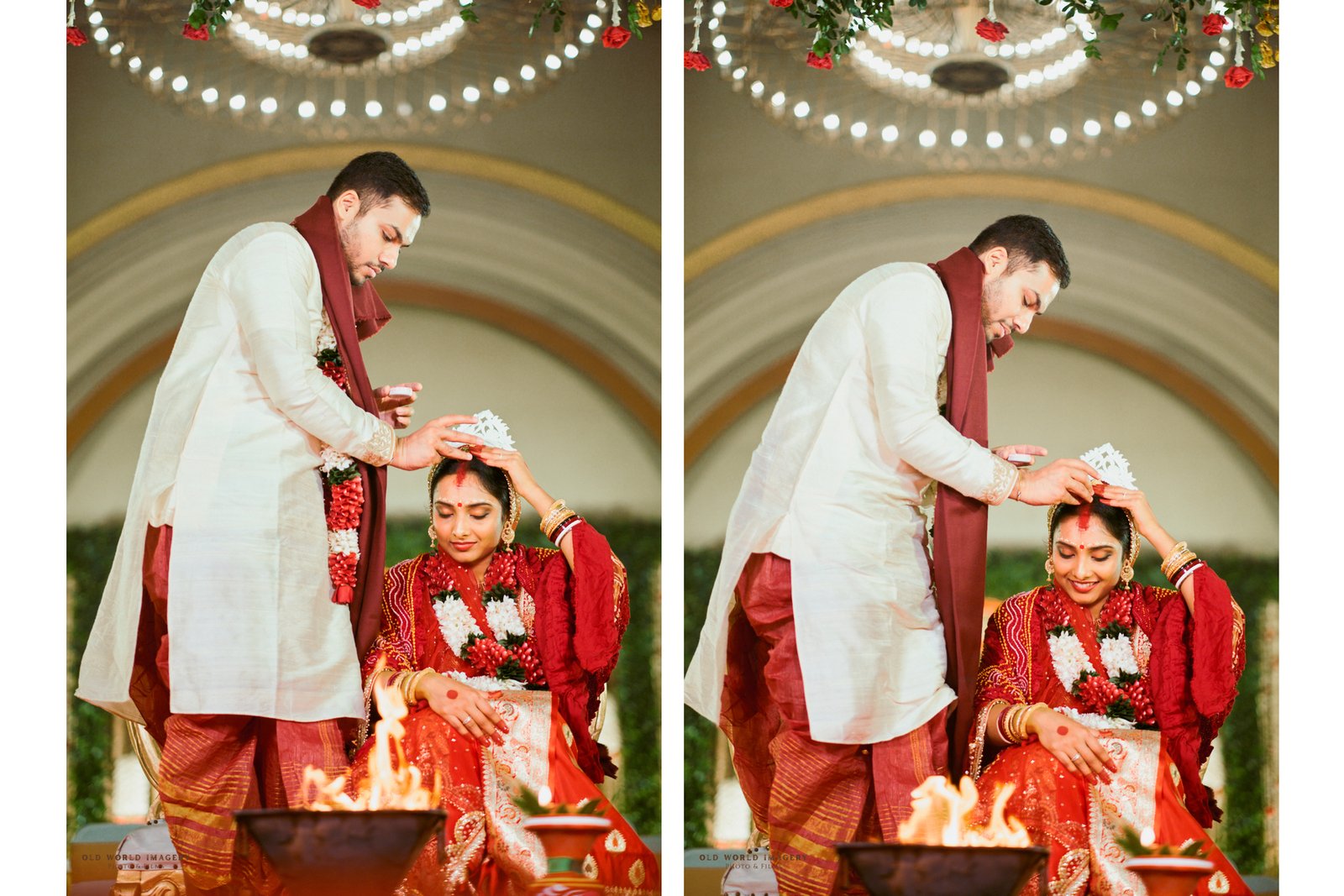 As a fun-loving couple, Amrita and Aagam’s wedding was filled with laughter, music, and dancing. The bride and groom looked stunning together, with Amrita in a traditional Bengali red Banarasi saree, adorned with gold jewellery, and Aagam in a sharp, cream-colored sherwani.